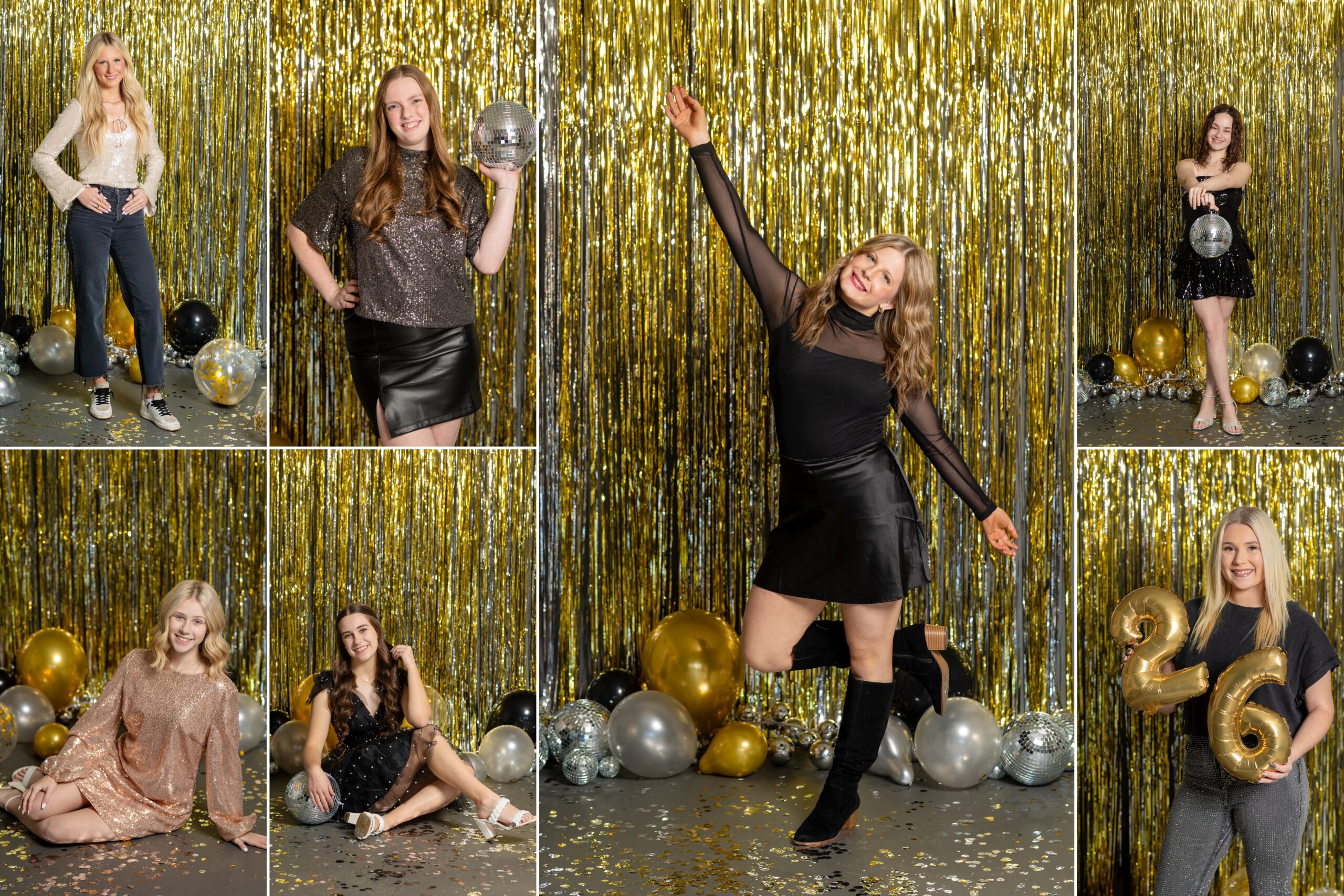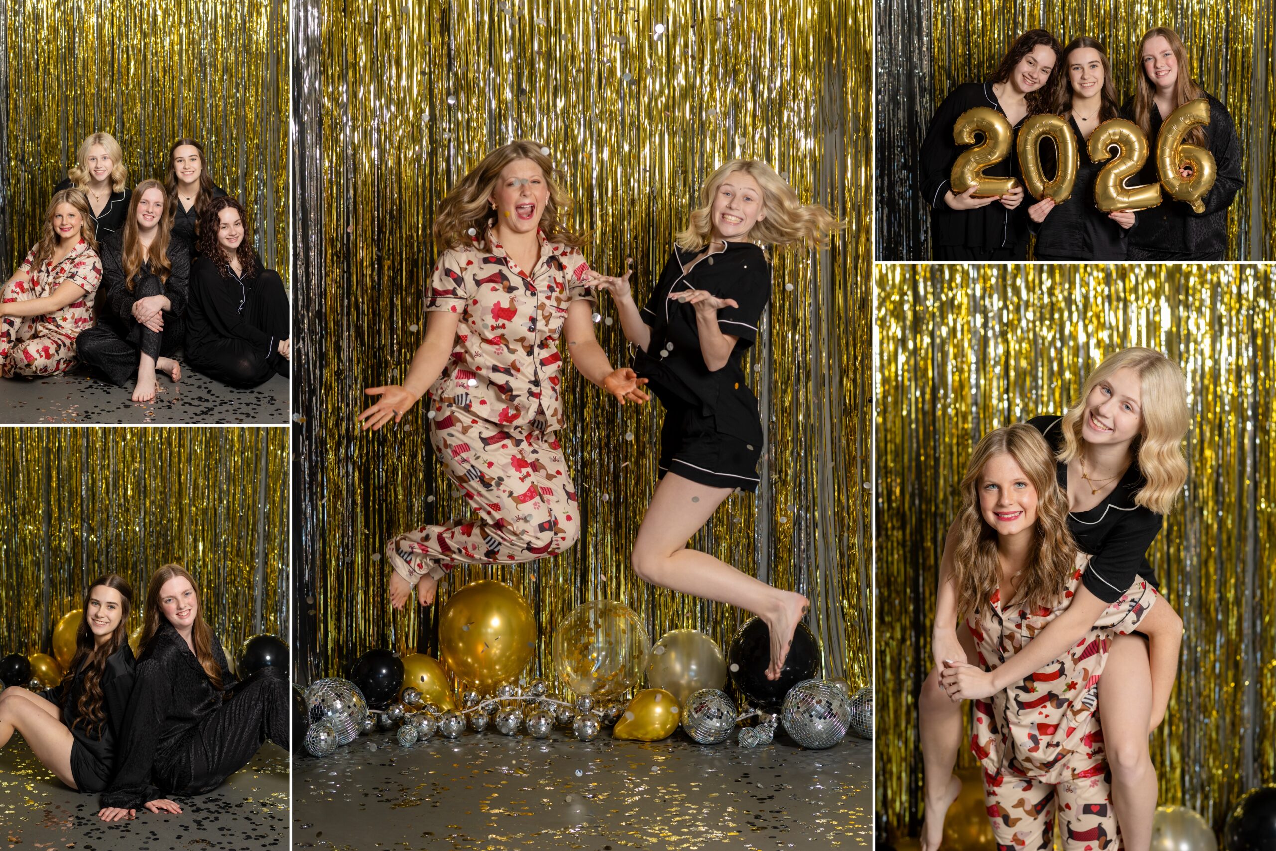 For this session, each girl brought two outfits. The first was a dressy or sparkly look that felt perfect for New Year’s Eve. Think sequins, black dresses, gold details, and all the fun party vibes. The second outfit was cozy pajamas. We love ending the session in PJs because it reminds everyone that senior year is not just about looking fancy. It is also about friendship, comfort, and having fun together.